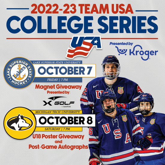 The Under-18 Team will host the Lake Superior State Lakers (Oct. 7) and Michigan Tech Huskies (Oct. 8) at USA Hockey Arena!